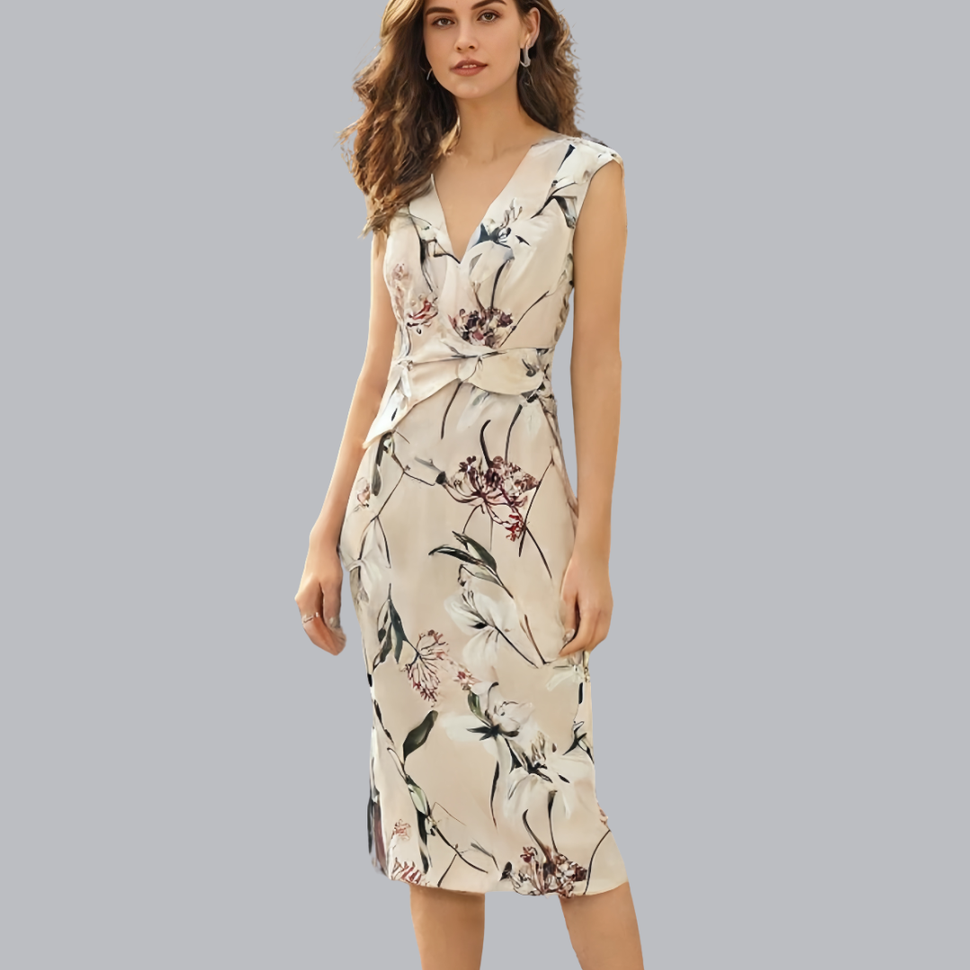 Dieses taillierte Etuikleid überzeugt mit einer Wickeloptik im Oberteil, einem klaren Schnitt und einem eleganten Muster. Es betont sanft die Figur und eignet sich ideal für elegante Tageslooks, Geschäftsmeetings oder besondere Anlässe – erhältlich in verschiedenen Varianten.