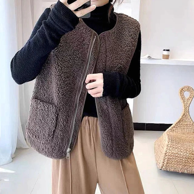 Genieße luxuriösen Komfort mit unserem Ärmellosen Gilet aus Kunstwolle! Dieser ärmellose Herbstmantel aus künstlichem Lammfell ist eine modische Wahl und verfügt über warme Taschen und einen stilvollen Reißverschluss. Erweitere deine Wintergarderobe mit diesem gemütlichen, lässigen Cardigan, der Mode und Funktion mühelos vereint.