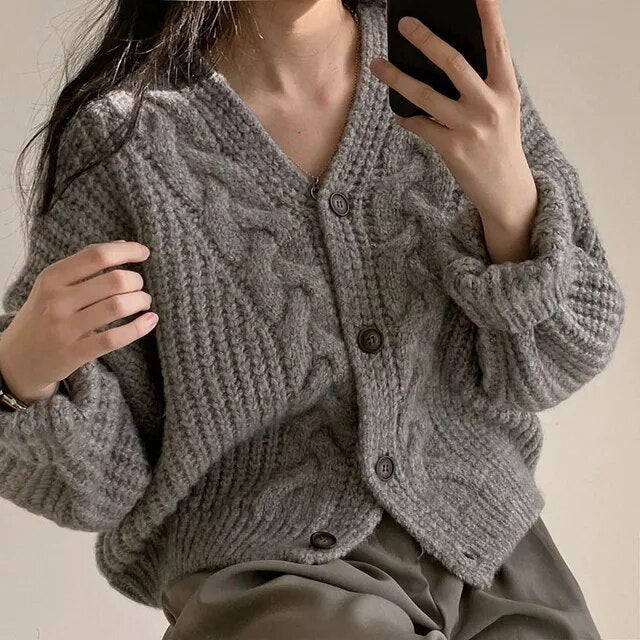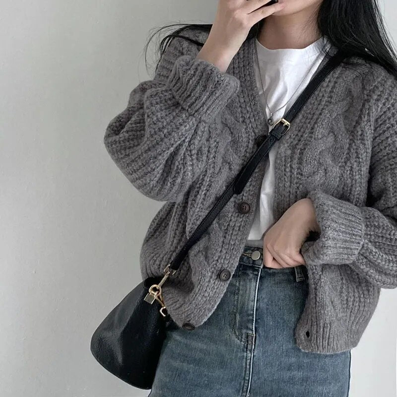 Genießen Sie das Beste aus beiden Welten mit unserem Ladies Winter Cardigan. Seine gestrickte Textur strahlt Vintage-Charme aus, während das schicke Design es in die moderne Zeit bringt. Egal, ob Sie die High Street erobern oder einfach nur einen Hauch koreanischer Mode verspüren, dieser Cardigan hat Sie im Griff.