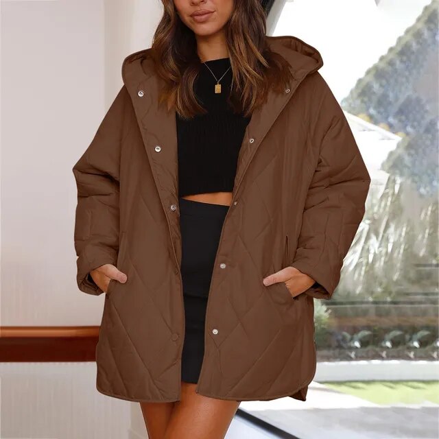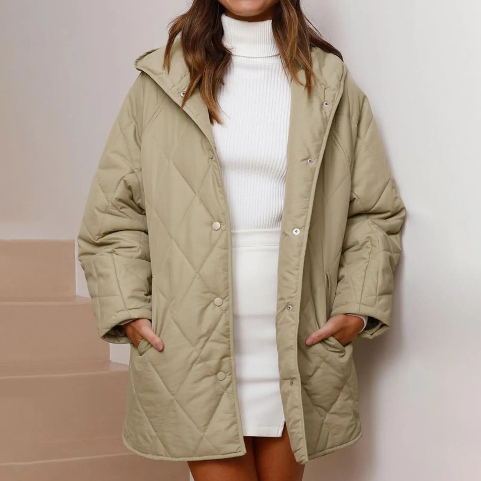 Begrüßen Sie die Kälte mit Stil in unserer Damen Winter Diamond Steppjacke mit Kapuze. Dieses gesteppte Wunder ist entworfen, um Sie den ganzen Winter über warm und modisch zu halten. Das Diamantmuster verleiht eine Prise Raffinesse, während die Kapuze zusätzliche Wärme und Charme bietet. Begrüßen Sie den Winter mit Selbstbewusstsein und Anmut!