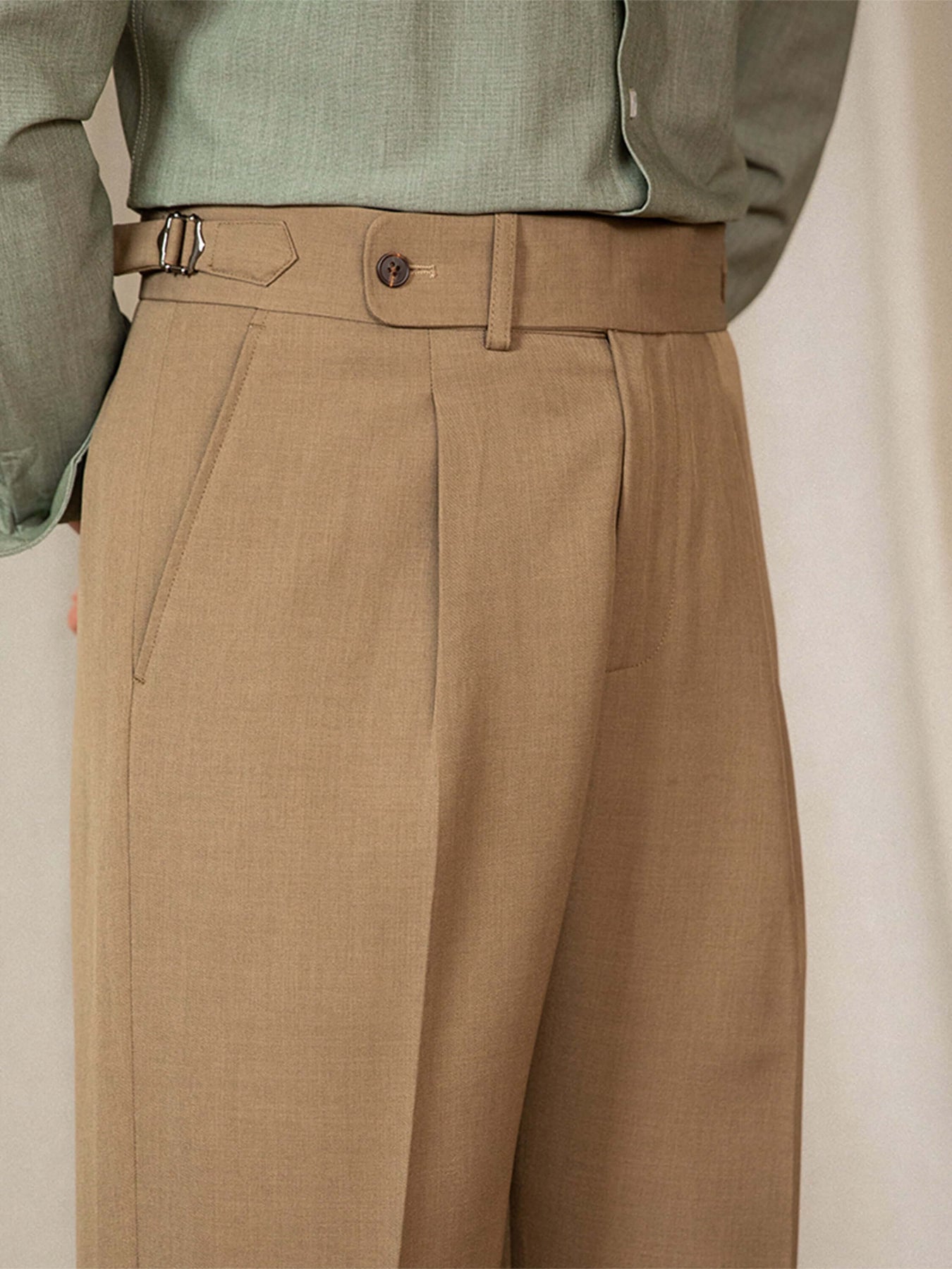 Entdecken Sie diese hochgeschnittene, lässige Herrenhose im Old Money-Stil, die ein modernes und elegantes Aussehen verleiht. Das Kleidungsstück ist perfekt für einen entspannten, aber dennoch stilvollen Look.