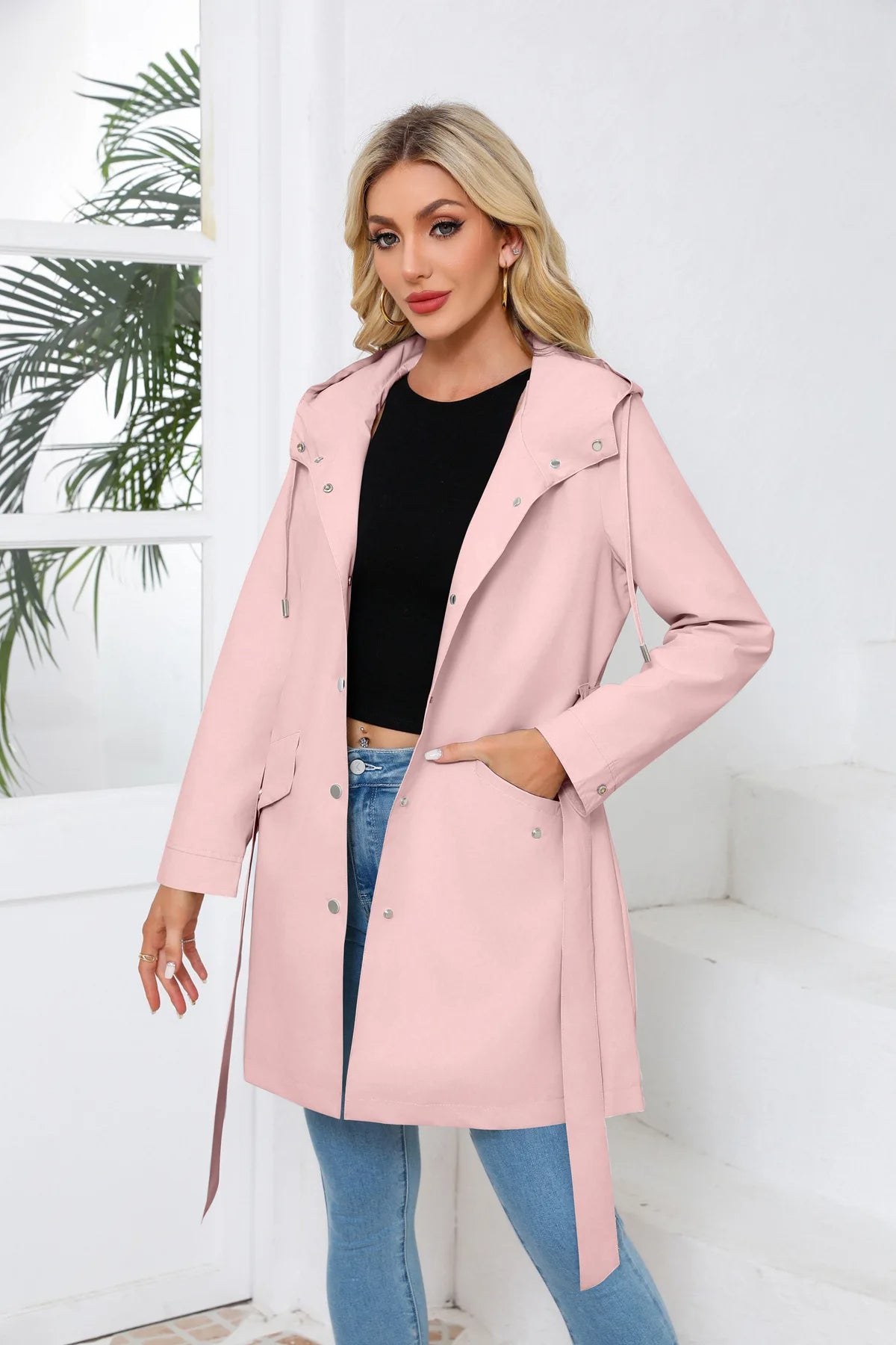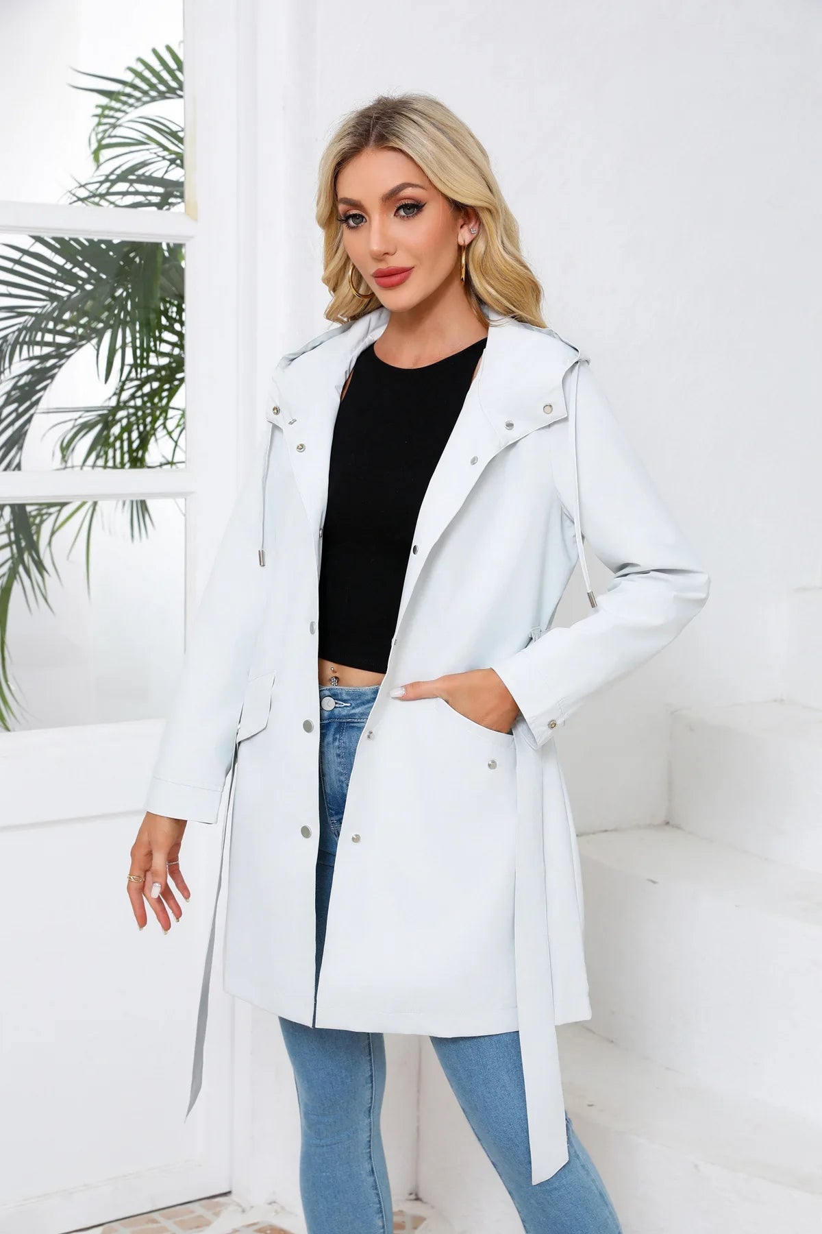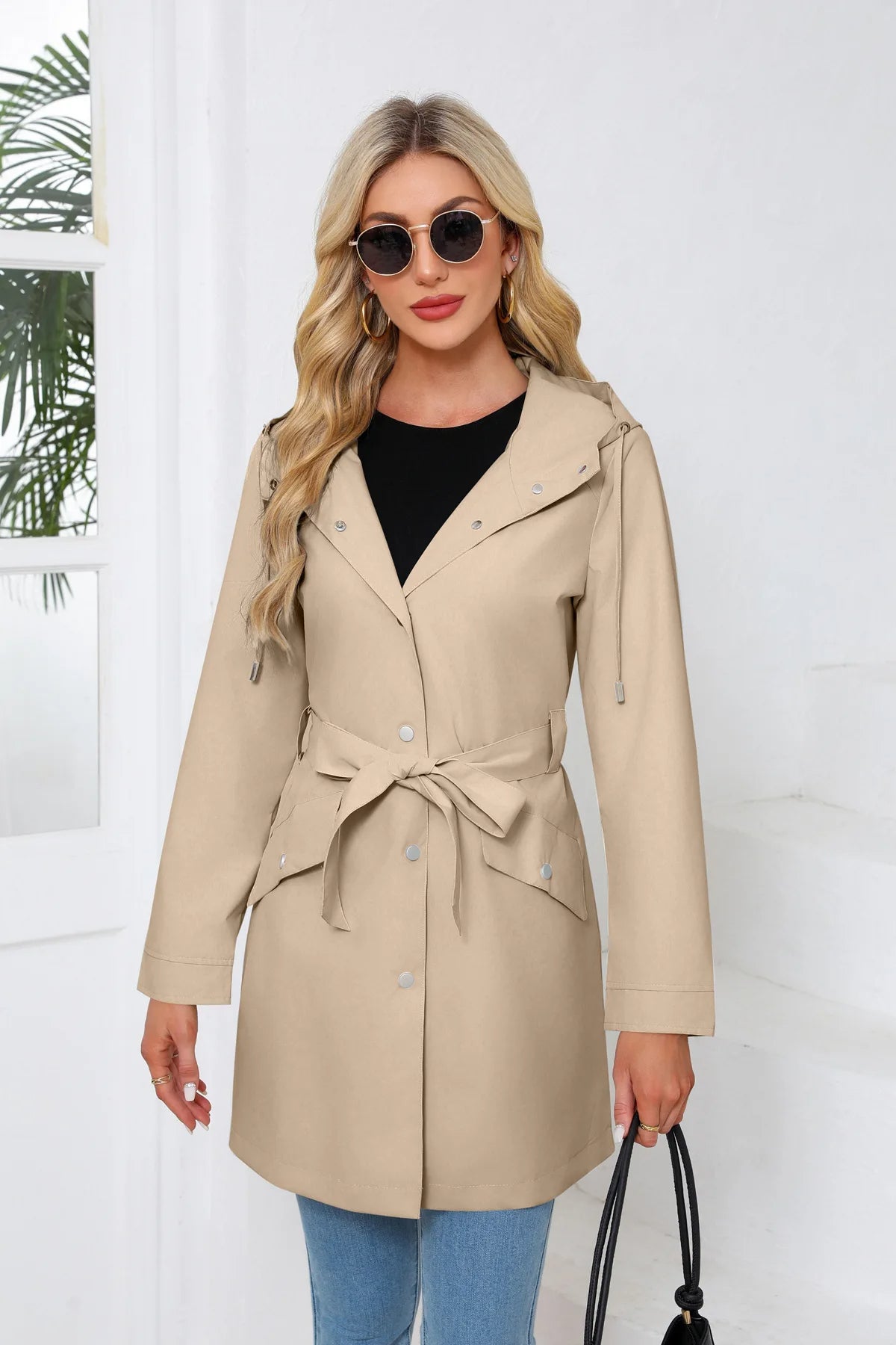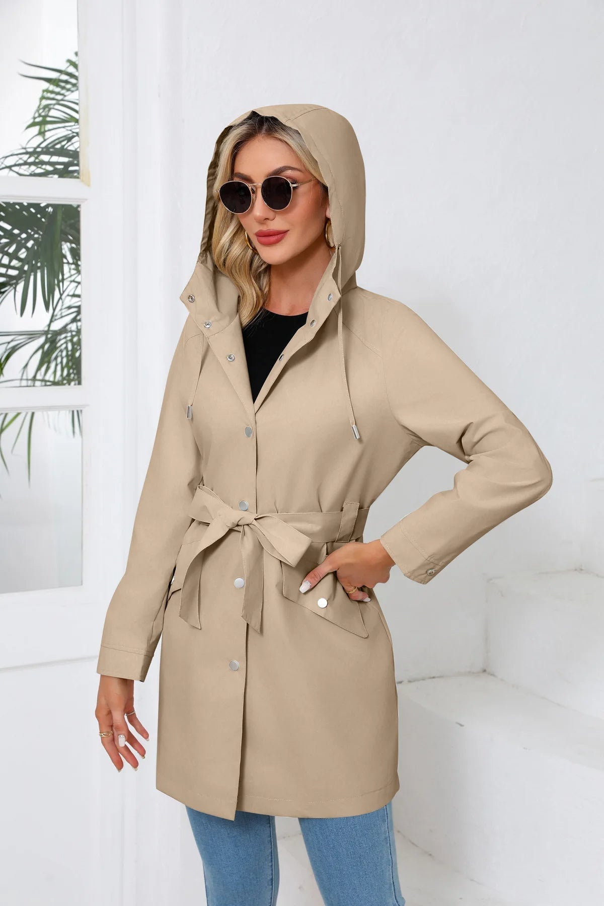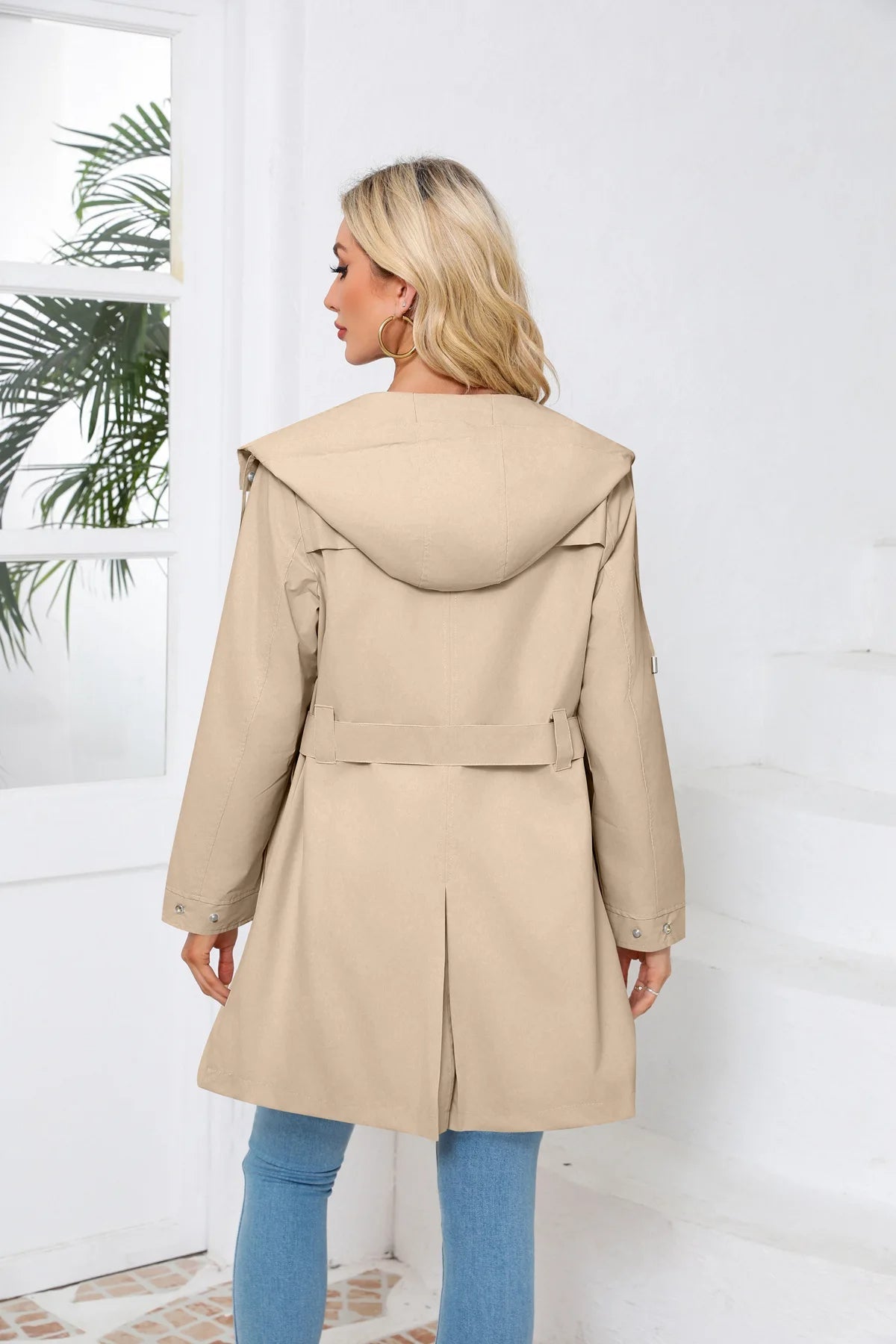 Unser langer Damenmantel mit Kapuze vereint stilvolles Design und Funktionalität, ideal für Frühling und Herbst. Der Mantel besticht durch seine wasserdichte Beschaffenheit und den eleganten Taillengürtel, der eine feminine Silhouette zaubert. Ein vielseitiges Kleidungsstück, das sowohl Komfort als auch Chic für jede Gelegenheit bietet.
