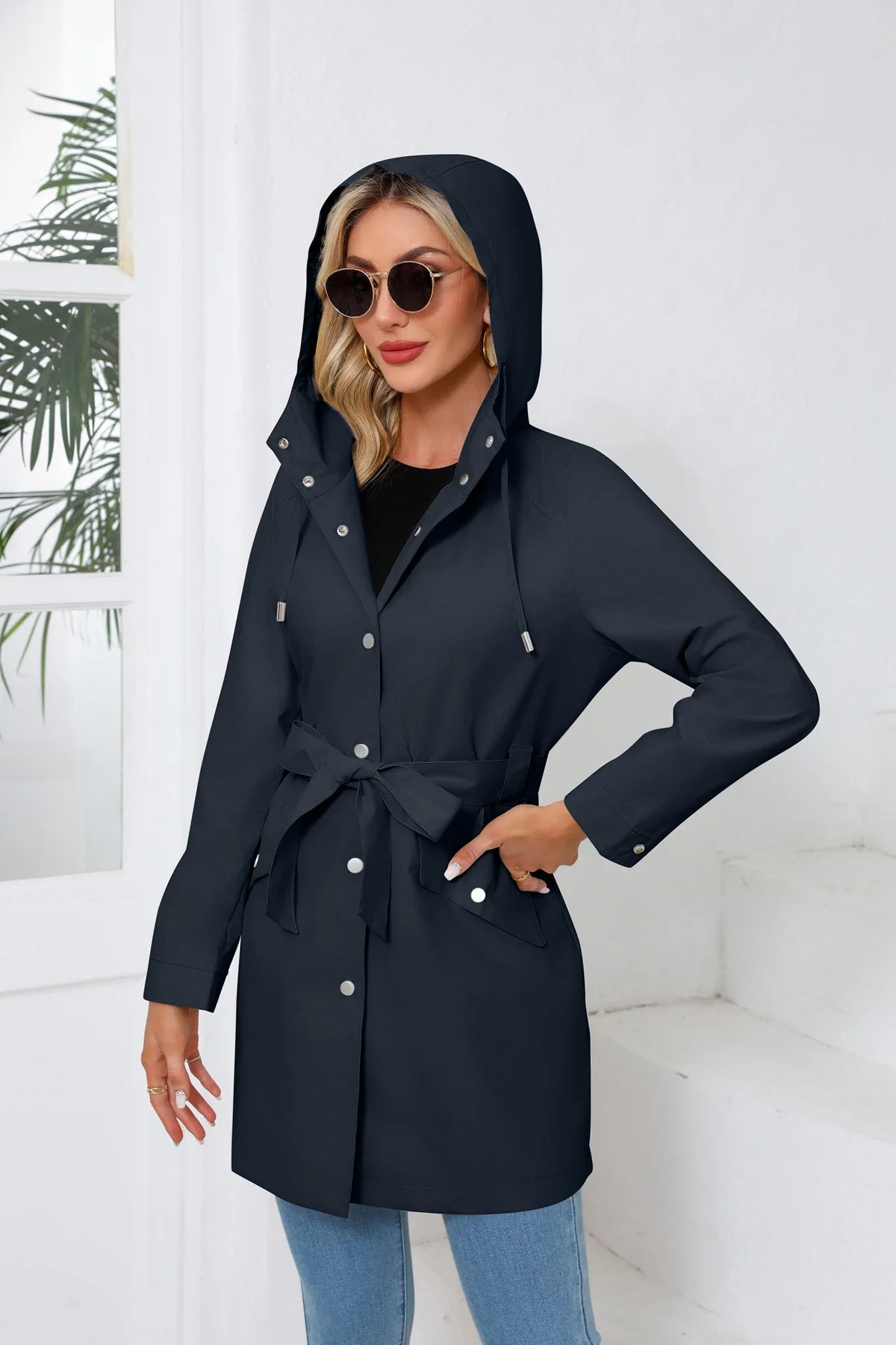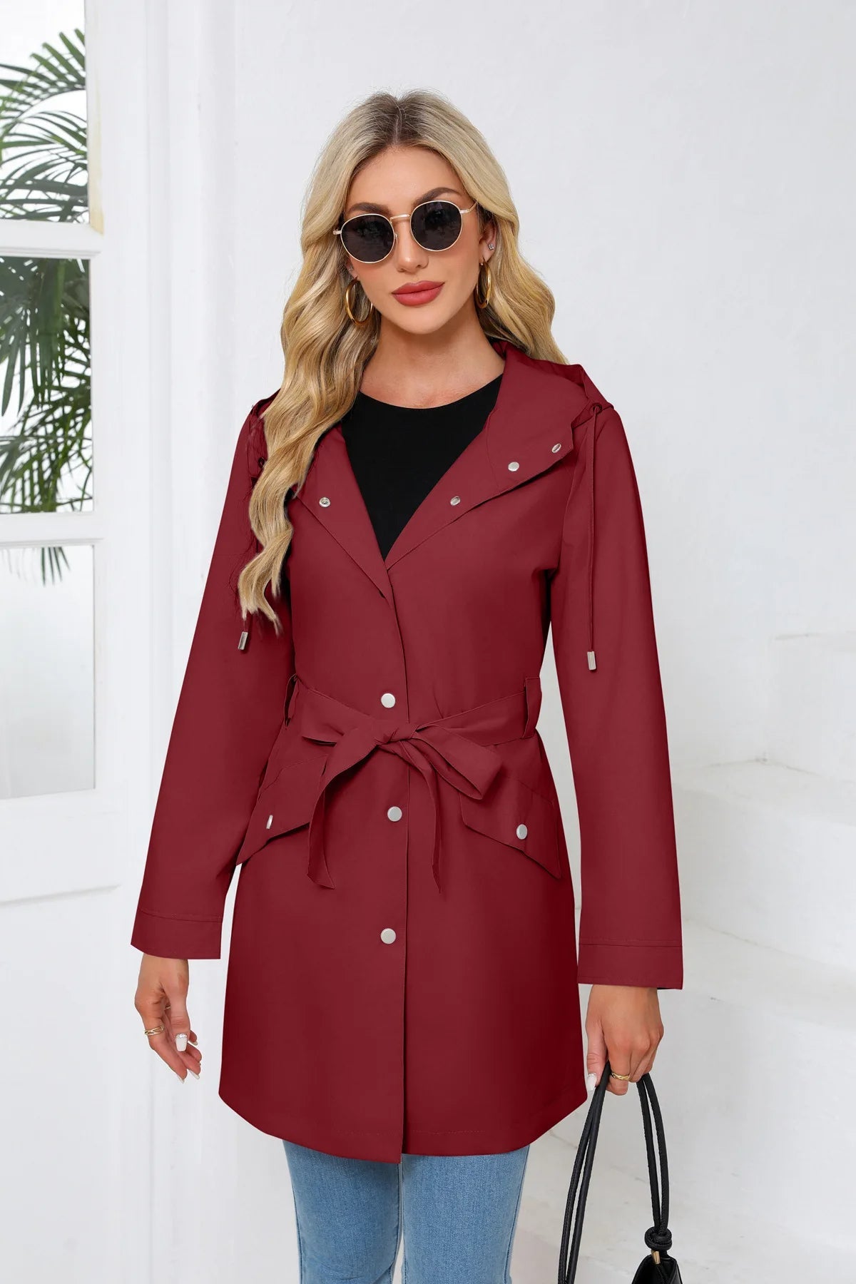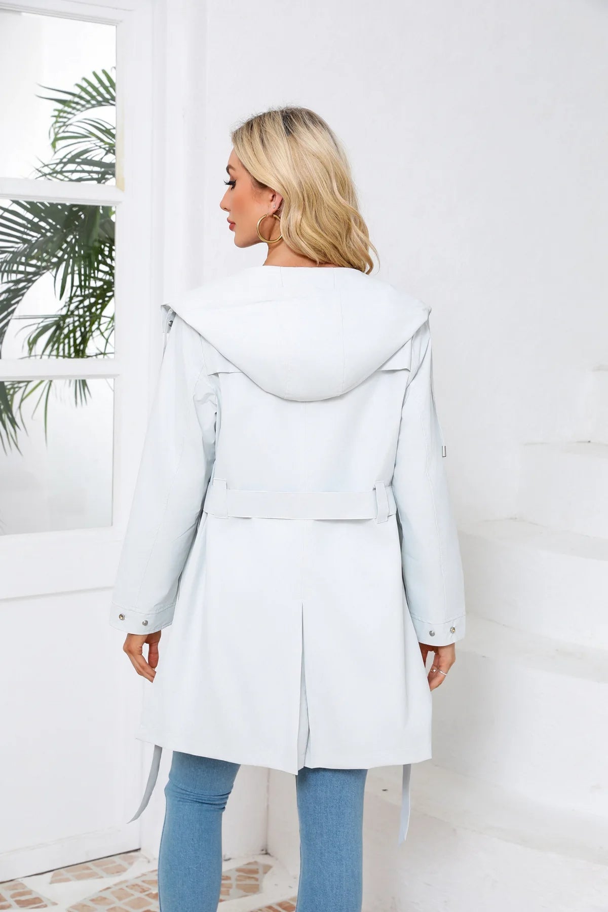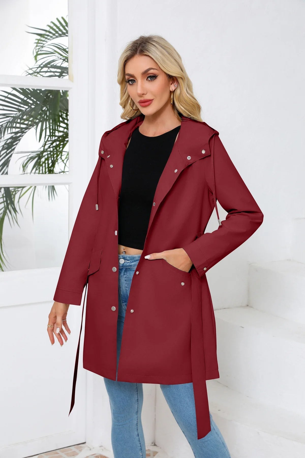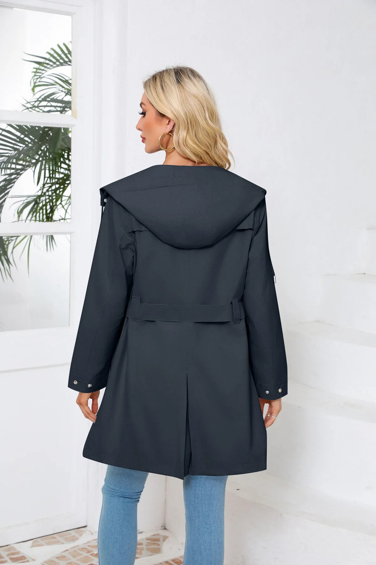 Unser langer Damenmantel mit Kapuze vereint stilvolles Design und Funktionalität, ideal für Frühling und Herbst. Der Mantel besticht durch seine wasserdichte Beschaffenheit und den eleganten Taillengürtel, der eine feminine Silhouette zaubert. Ein vielseitiges Kleidungsstück, das sowohl Komfort als auch Chic für jede Gelegenheit bietet.