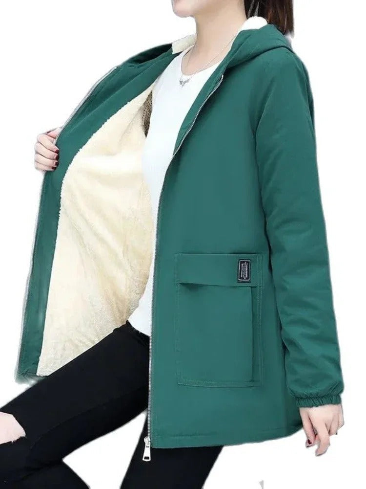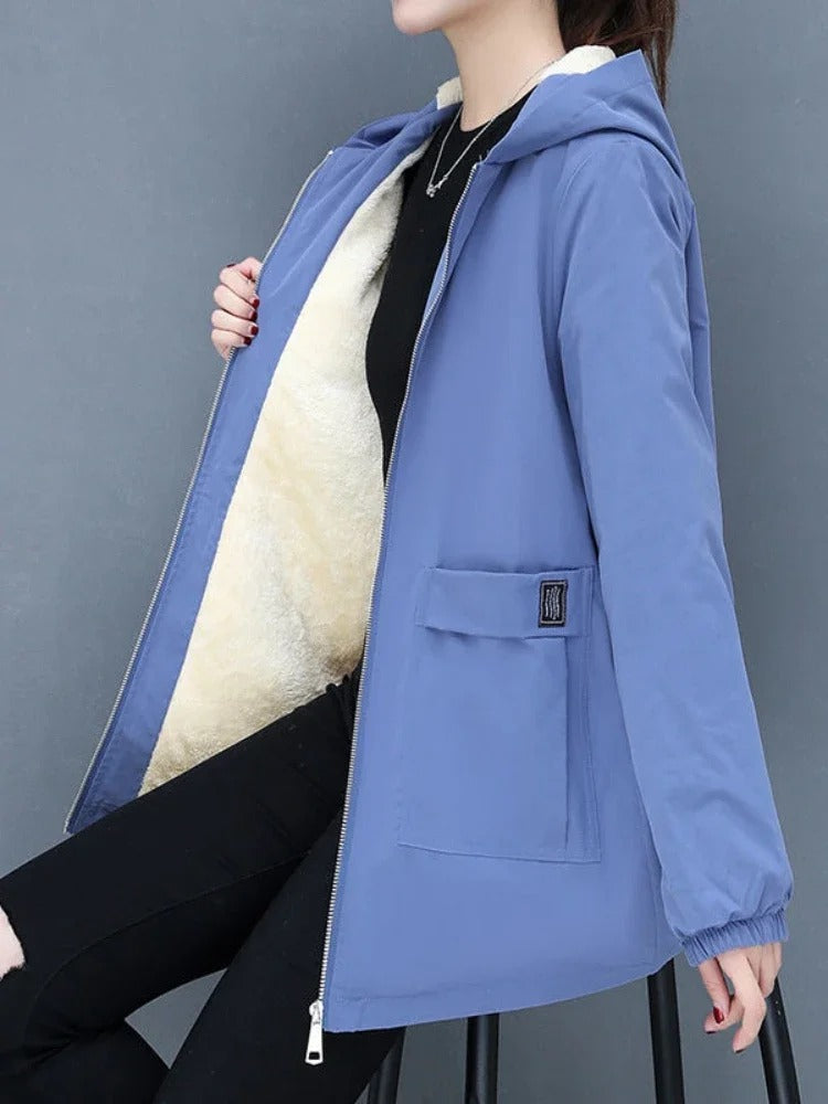 Die Mia Kapuzenjacke ist ideal für kühle Tage und bietet angenehme Wärme durch ihr flauschiges Futter. Mit einer praktischen Kapuze und großen Taschen ist sie sowohl funktional als auch stilvoll. Perfekt für Frauen, die Komfort und einen lässigen Look suchen