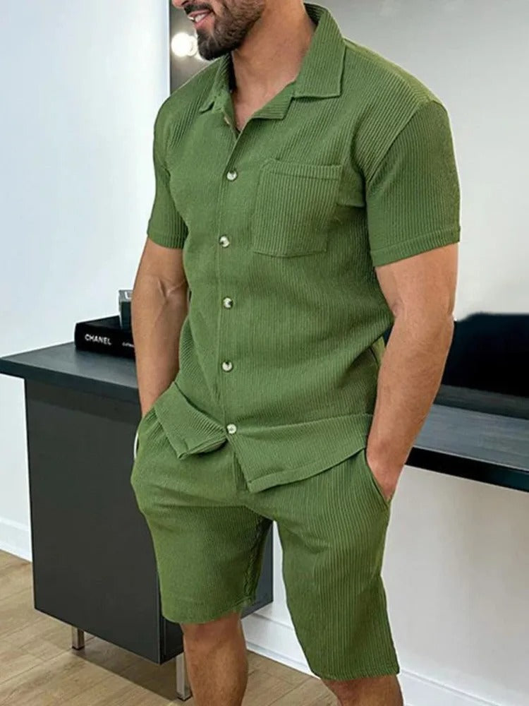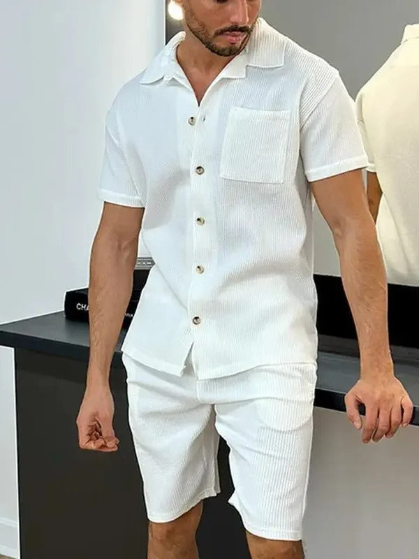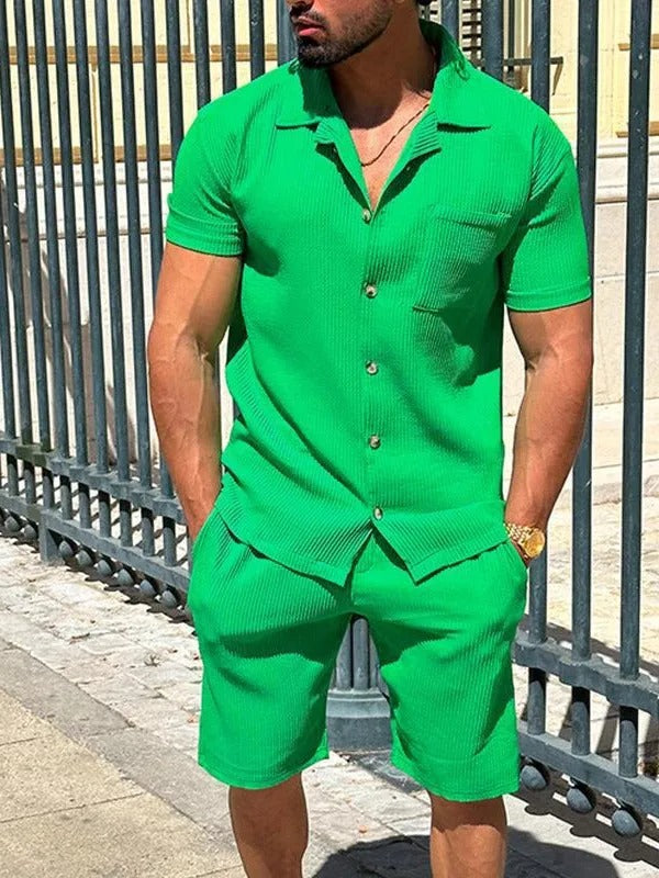 Entfessele deine innere Coolness mit unserem Men's New Casual Summer Suit – ein wegweisendes Outfit, das Selbstbewusstsein und Stil ausstrahlt. Das Hemd mit Knopfleiste und Reverskragen sowie die kurzärmeligen Shorts vereinen Praktikabilität mit trendigem Design und machen es zu einem unverzichtbaren Bestandteil der Garderobe. Umarme die entspannten Vibes des Sommers und setze ein Statement mit diesem mühelos schicken Zweiteiler!