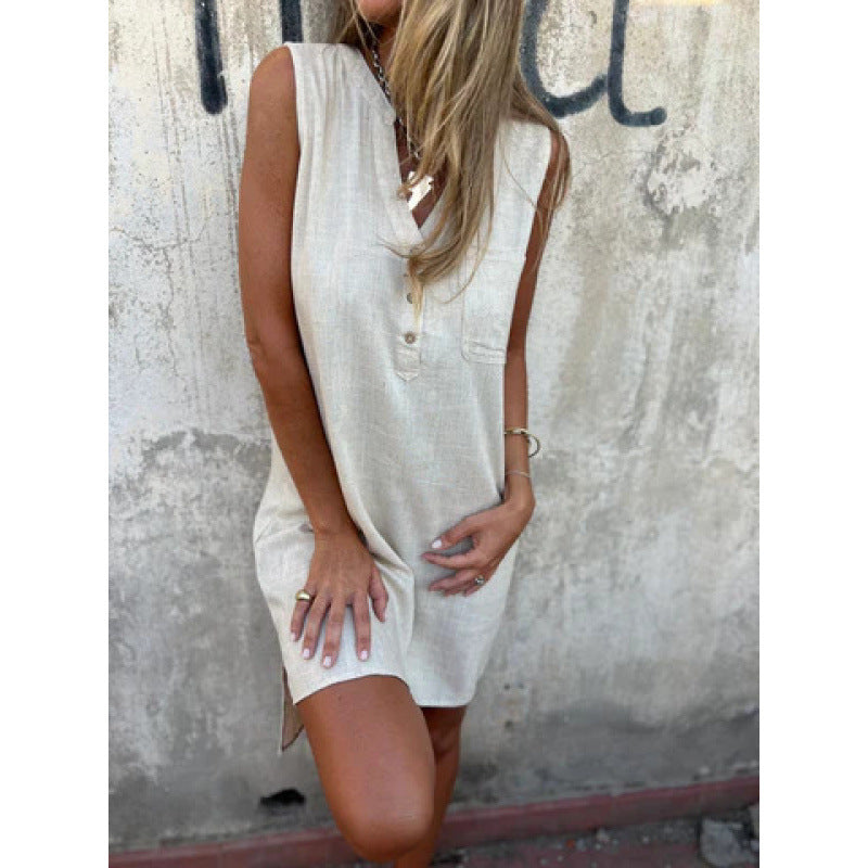 Fudus | Leinenkleid Lässig Locker Ärmellos Leinenkleid