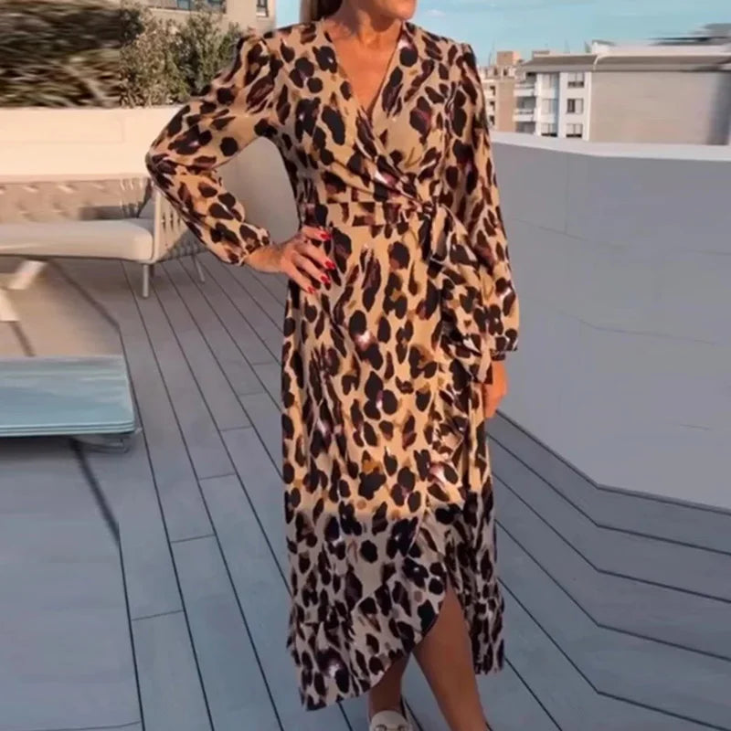 Gabrielle - Langärmeliges Wickelkleid für Damen - Leopardenmuster V-Ausschnitt Maxikleid