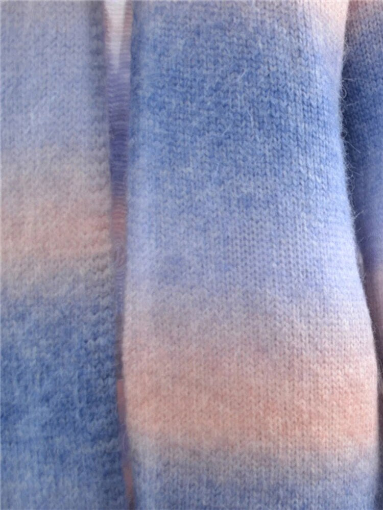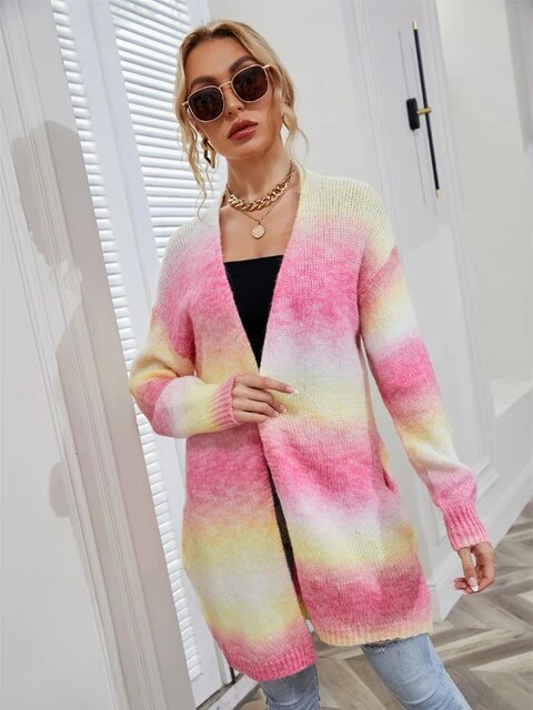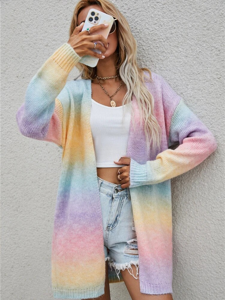 Bereiten Sie sich darauf vor, von unserem atemberaubenden langen Strick-Cardigan verzaubert zu werden. Es ist eine lebendige Explosion von Farben, wie ein im Stoff eingefangener Regenbogen. Mit einem einzigartigen Batikmuster, das ganz individuell ist, strahlt dieser Cardigan Positivität und Stil aus.