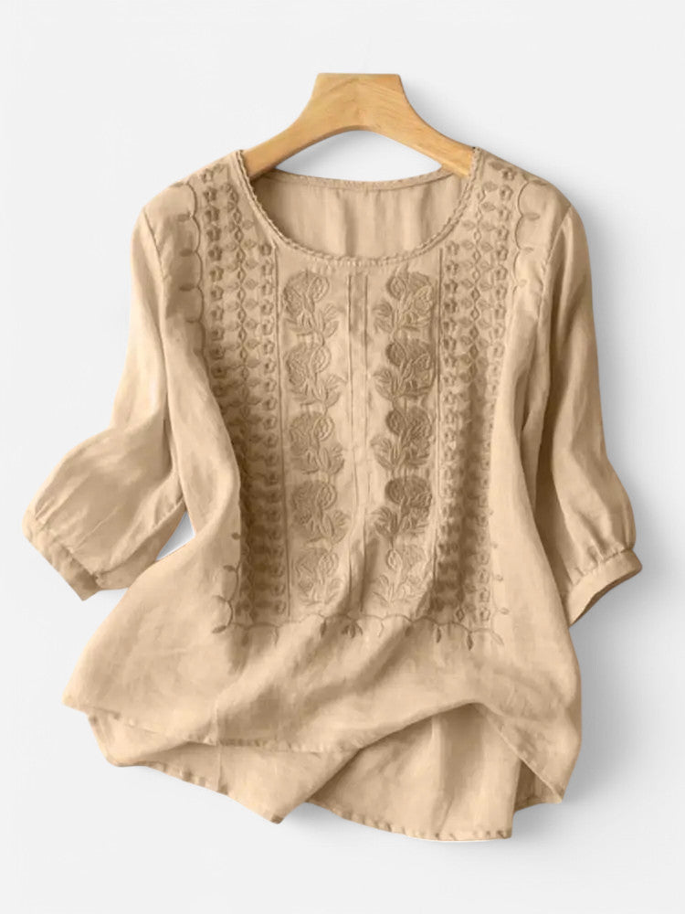 Der dezente Rundhalsausschnitt und die lockeren 3/4-Ärmel sorgen für eine elegante Silhouette und schmeicheln jeder Figur – ideal, wenn du dich stilvoll, aber nicht zu aufwendig kleiden möchtest.
