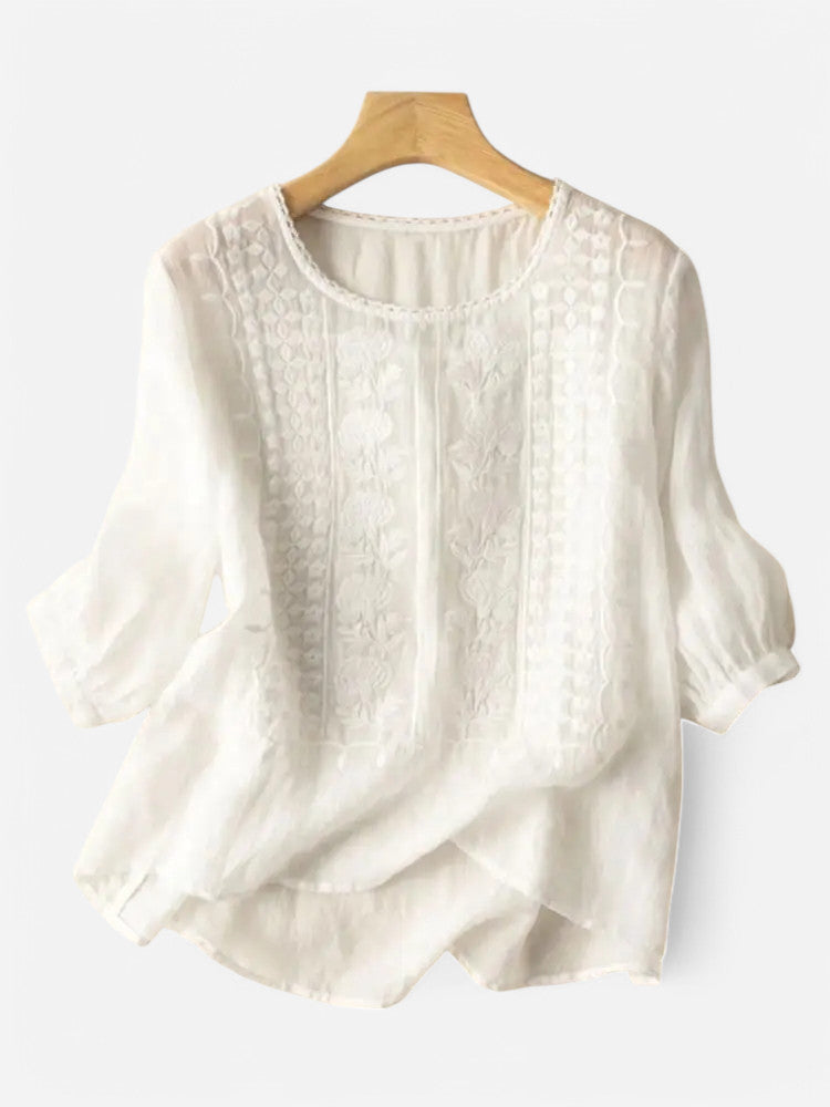 Fein gearbeitete Häkelverzierungen machen diese Bluse zu einem wahren Blickfang und bringen den Vintage-Stil perfekt in die Gegenwart.
